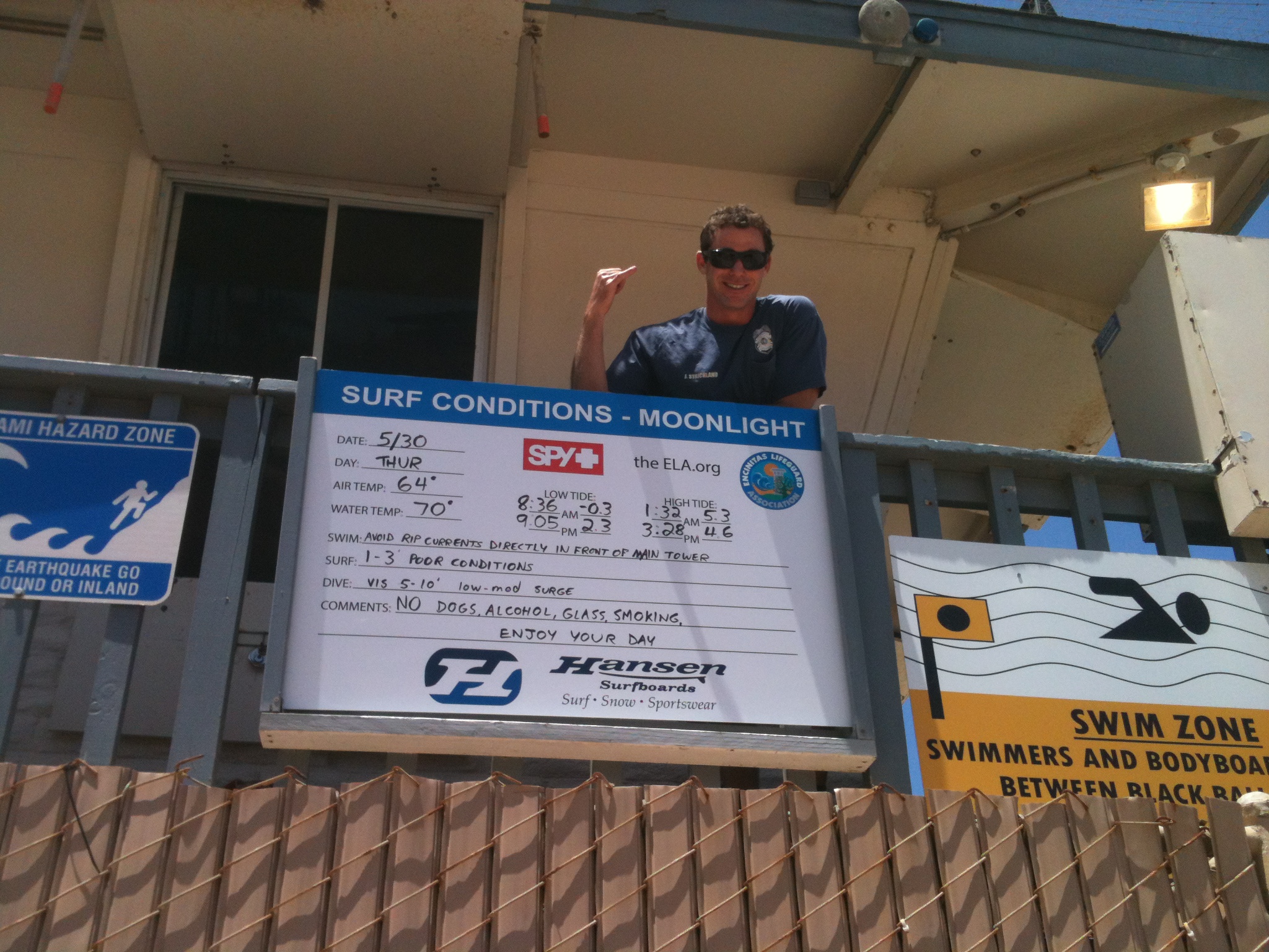 That’s Sergeant Strickland giving a shaka over the new tide boards at Moonlight Beach.