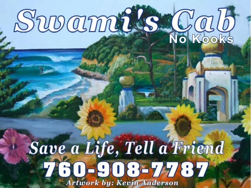 Thank you Swami’s Cab! Serving the coastal cities of Del Mar, Solana Beach, Encinitas and Carlsbad, Swami’s cab is the most trusted name in town for a safe ride. Swami’s has over ten different drivers, all of whom are upstanding locals you would feel safe sending your grandmother with. Unlike Uber or any ride share apps, Swami’s has only fully licensed drivers who are commercially insured and background checked and drug screened through the San Diego Sherriff’s department. ‘No Kooks’ is their motto and they live it!