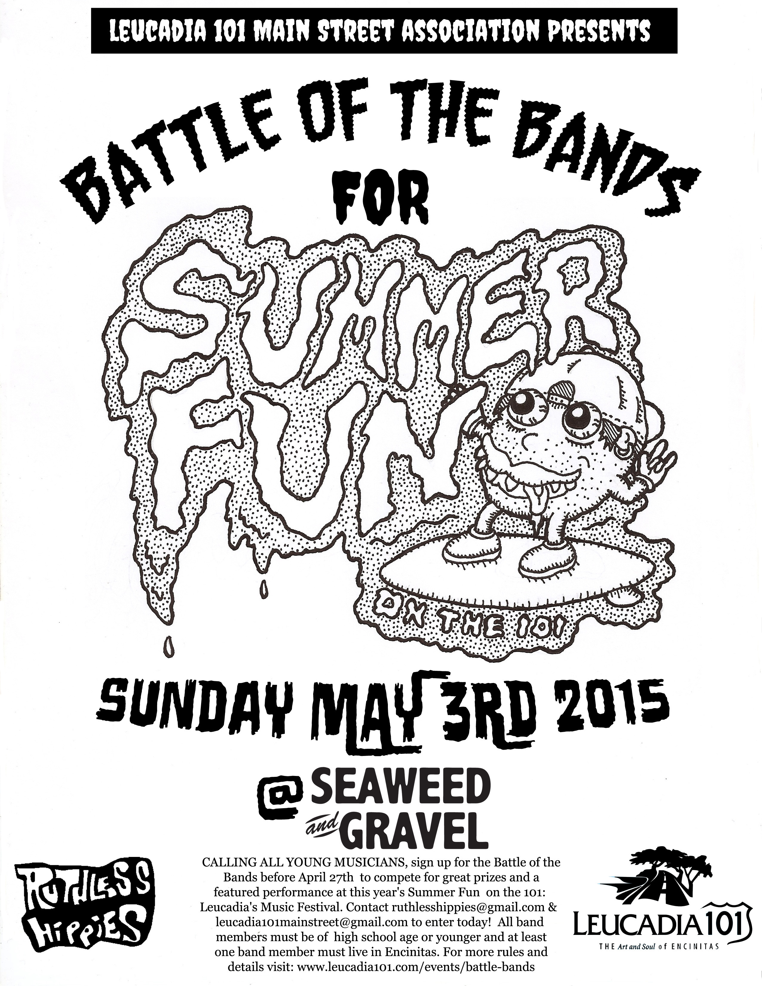 On Sunday May 3rd at Seaweed and Gravel, each band that enters will have twenty minutes on stage to impress the judges and audience. At the end of the concert, our expert panel of judges will choose one band, and a second band will be chosen by audience vote. These two bands will win special prizes and the opportunity to play at this year’s Summer Fun on the 101: Leucadia’s Music Festival being held on June 26th and 27th, 2015.